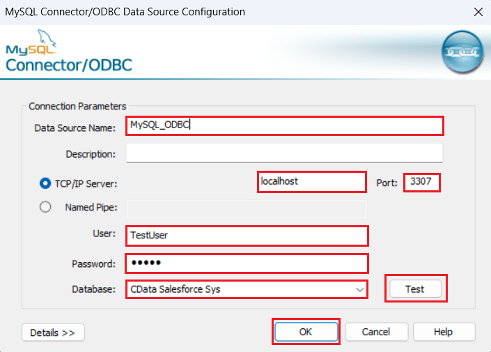 - Enter the following connection details in the MySQL Connector/ODBC Data Source Configuration window: