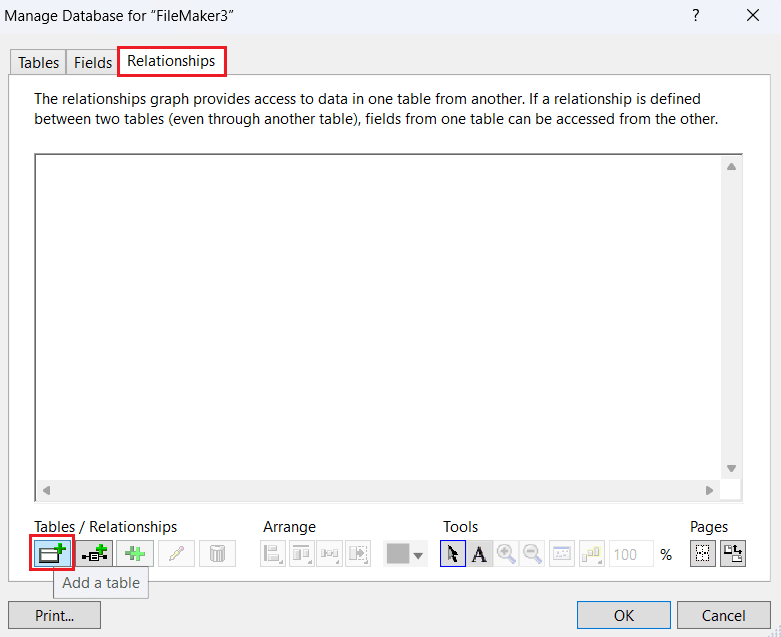 - In Manage Database, remove the Tables and Fields from the respective tabs. Select the Relationships tab and click Add Table.