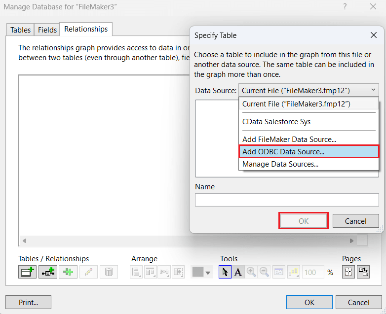 - In Specify Table, expand the Data Source dropdown menu and select Add ODBC Data Source. Click OK.