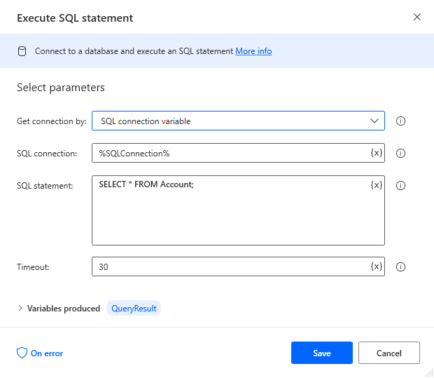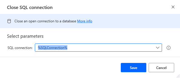 - SQL connection: %SQLConnection% (the variable from the "Open SQL connection" action above)