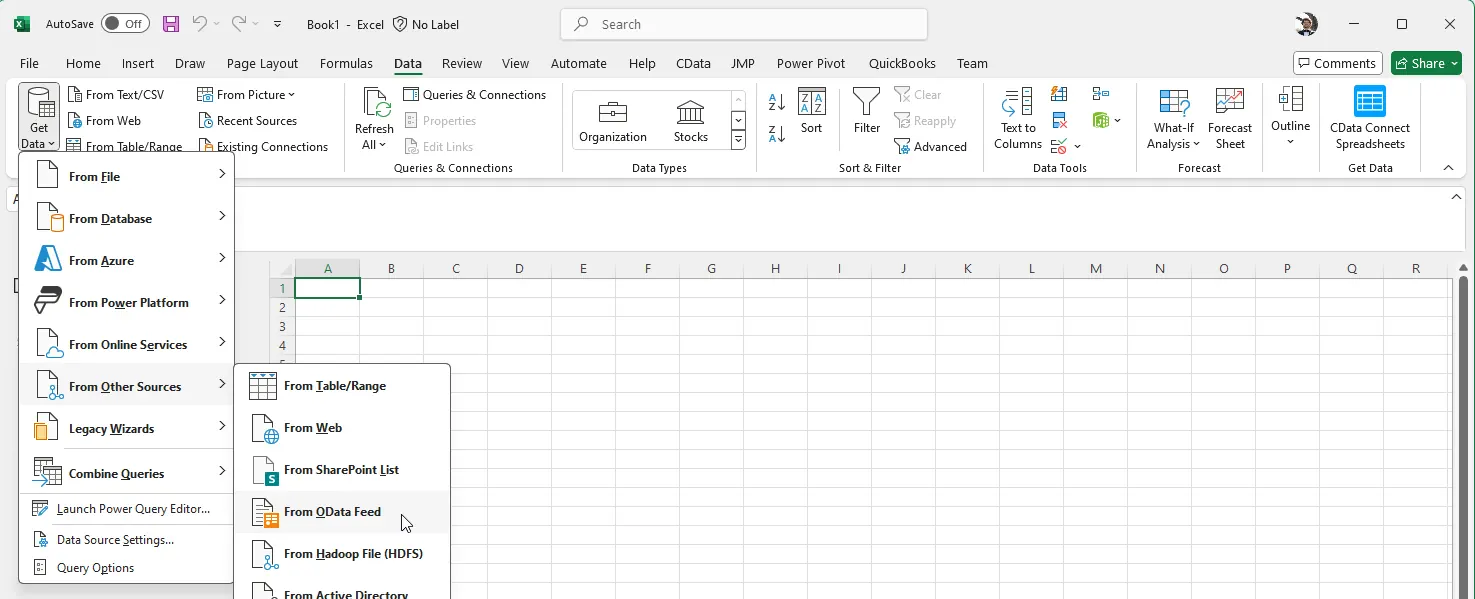 In Excel, click Data -> Get Data -> From Other Sources -> From OData Feed