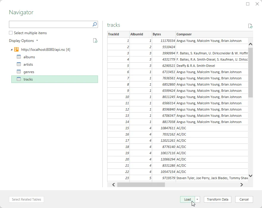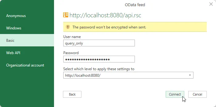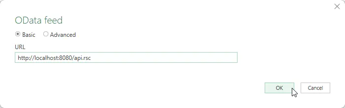 In the OData feed connection, set the URL property to the OData Endpoint URL previously copied and click OK (e.g. "http://localhost:8080/api.rsc"):