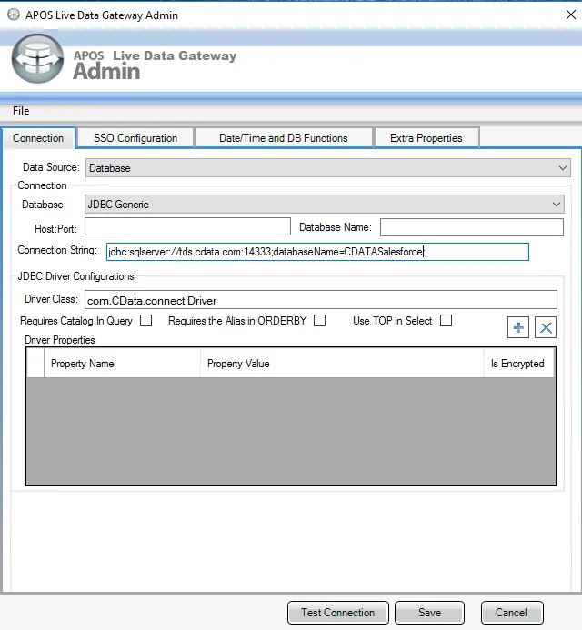 - In the APOS Live Data Gateway On the Connection tab, configure the connection: