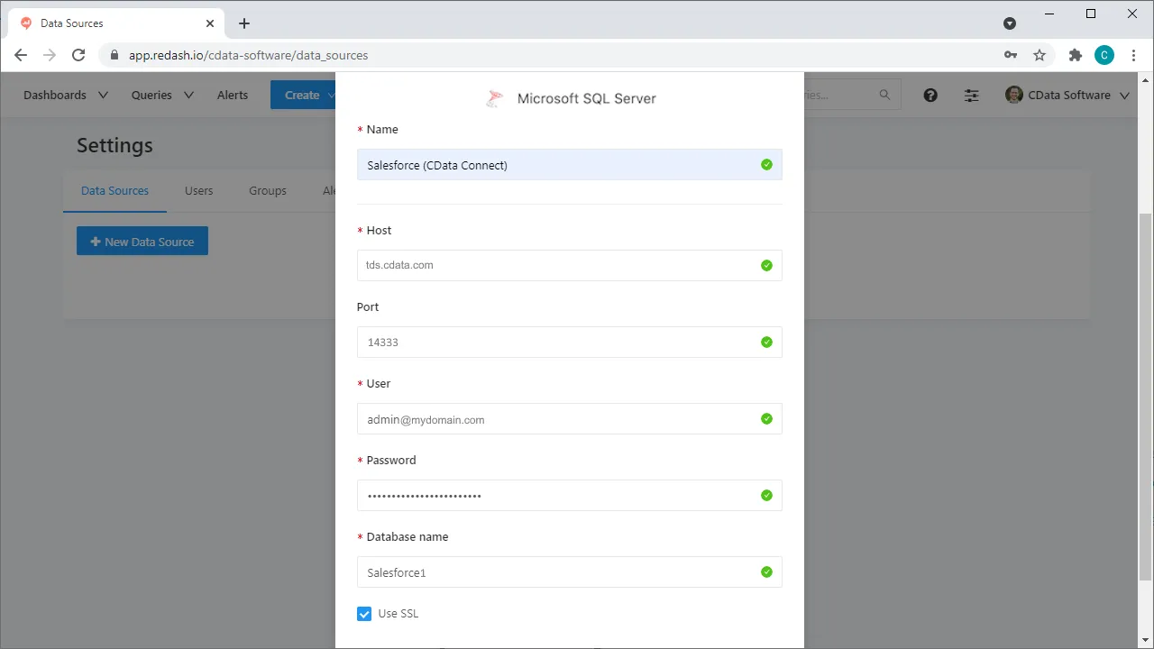 Connectivity to SQL Server from Redash is made possible through CData Connect Cloud. To work with SQL Server data in Redash, we start by creating and configuring a SQL Server connection.