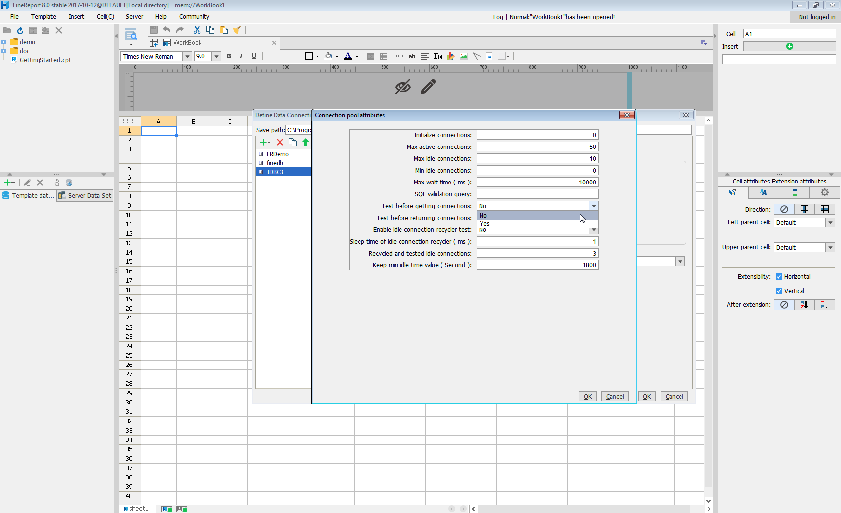 jdbc:sql:User=myUser;Password=myPassword;Database=NorthWind;Server=myServer;Port=1433; - Click Connection pool attributes and set Test before getting connections to No.