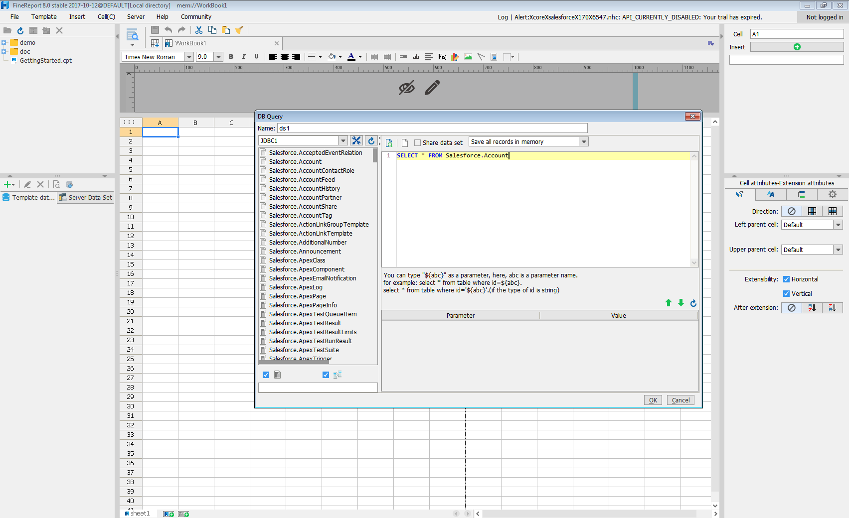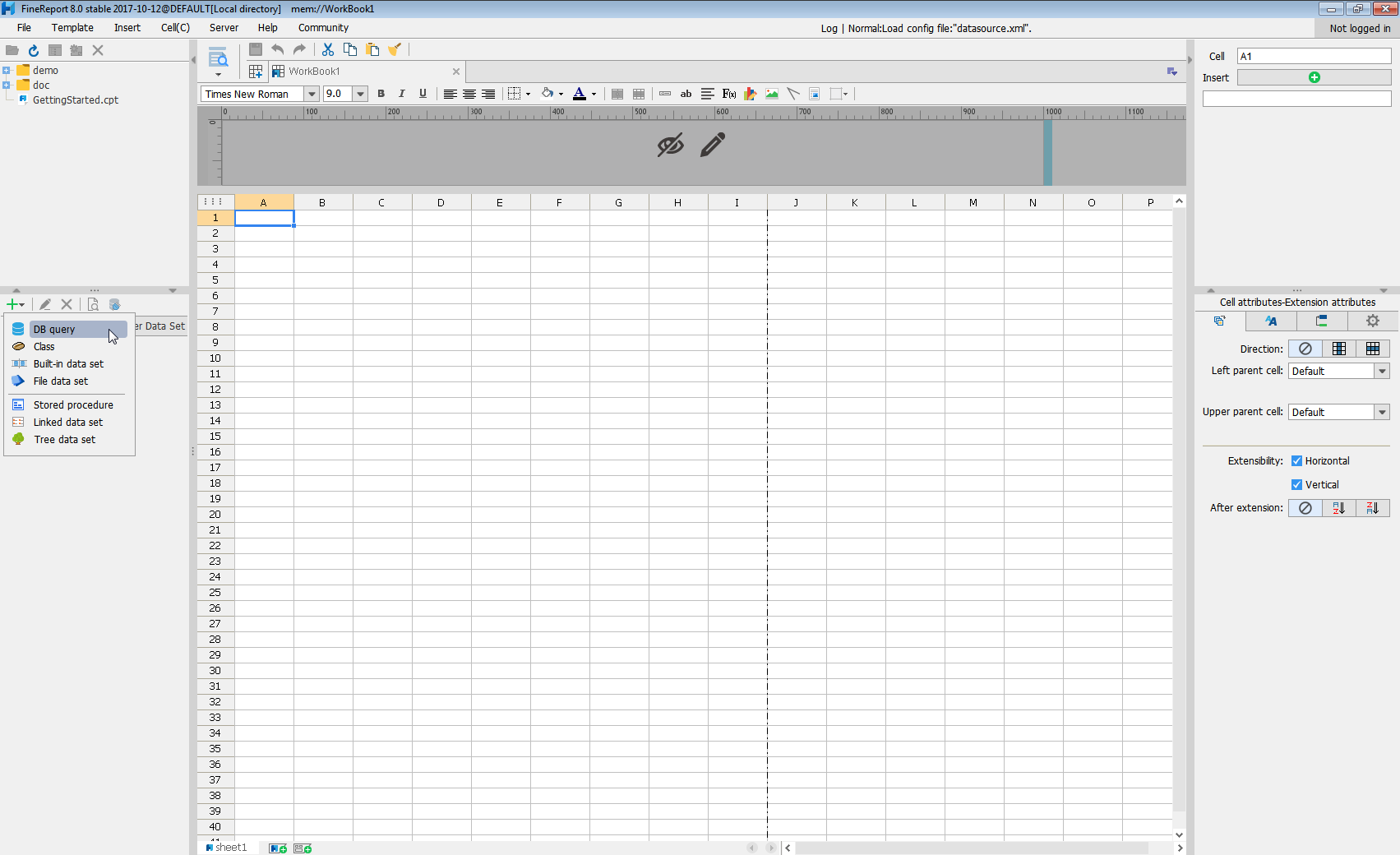 - Click to add a new template data set and select DB query to open the database query window.