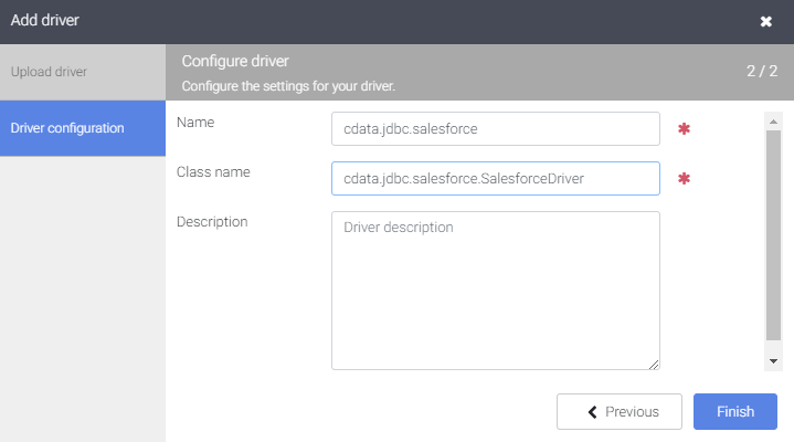 - Name: Create a name for the driver (cdata.jdbc.sql) and make note of the name