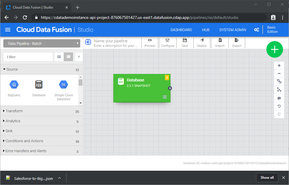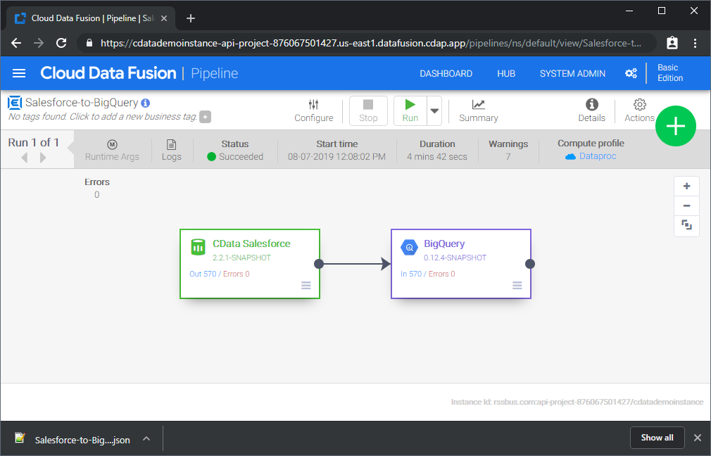 With the Source and Sink configured, you are ready to pipe SQL Server data into Google BigQuery. Save and deploy the pipeline. When you run the pipeline, Google Data Fusion will request live data from SQL Server and import it into Google BigQuery.