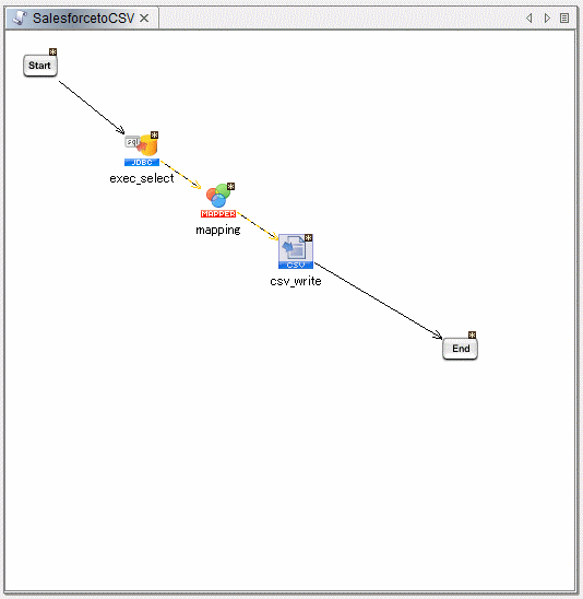 Drag the "Start" component onto the "Select" component and the "CSV" component onto the "End" component. Build the script and run the script to move SQL Server data into a CSV file.