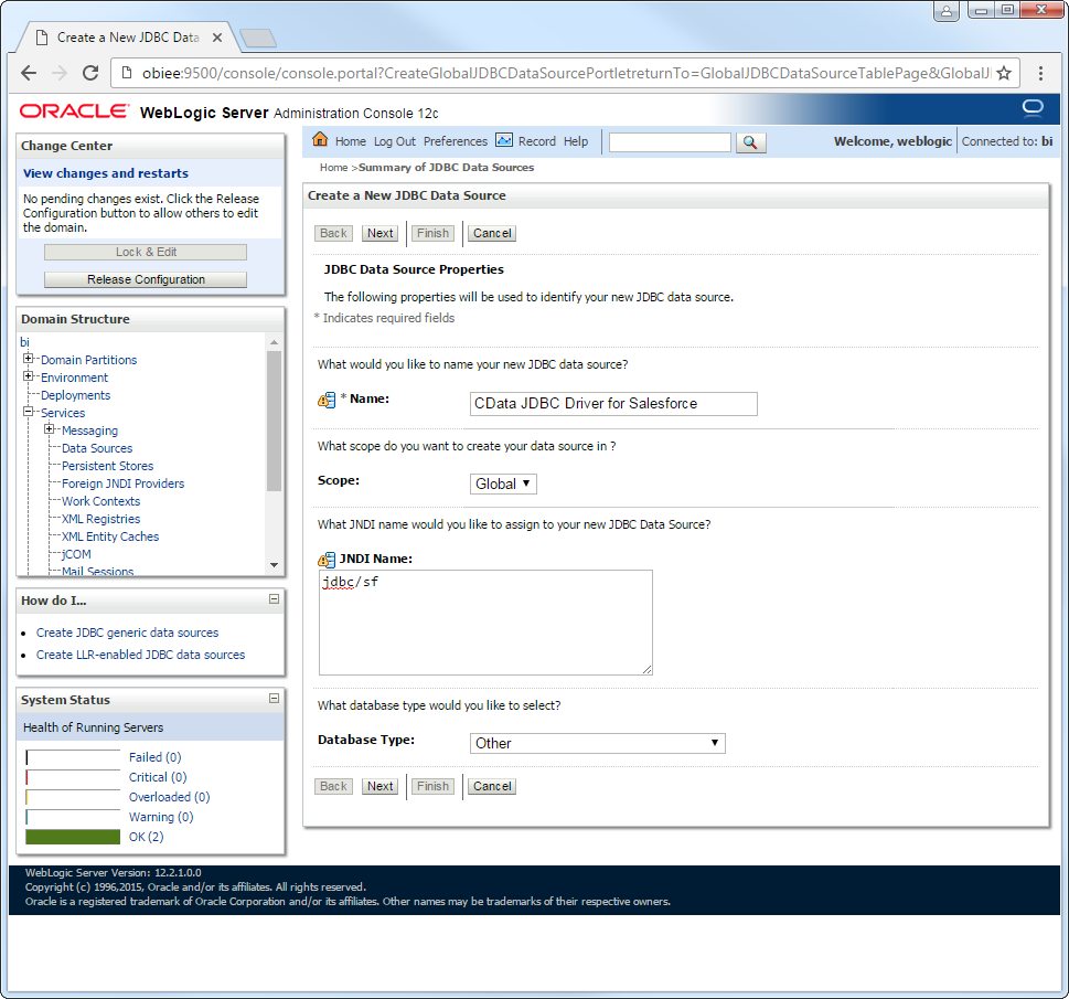 After deploying the driver, log into the WebLogic Administration Console and create the connection.