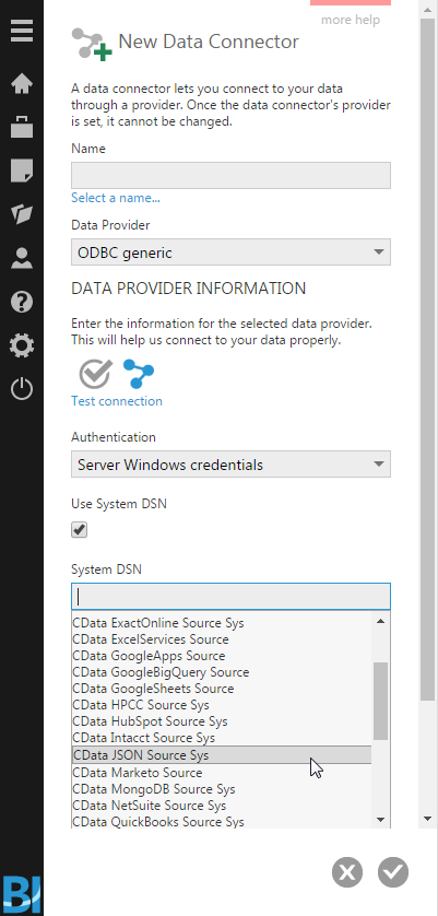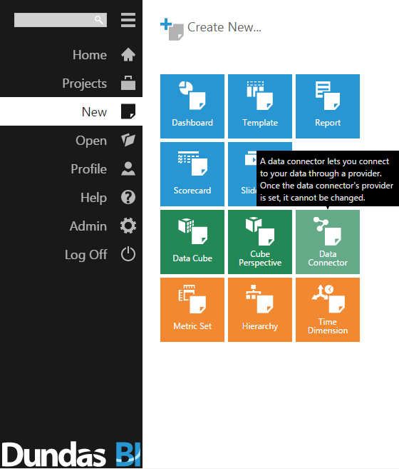 - Open the Dundas BI interface, open the menu, and click New Data Connector.