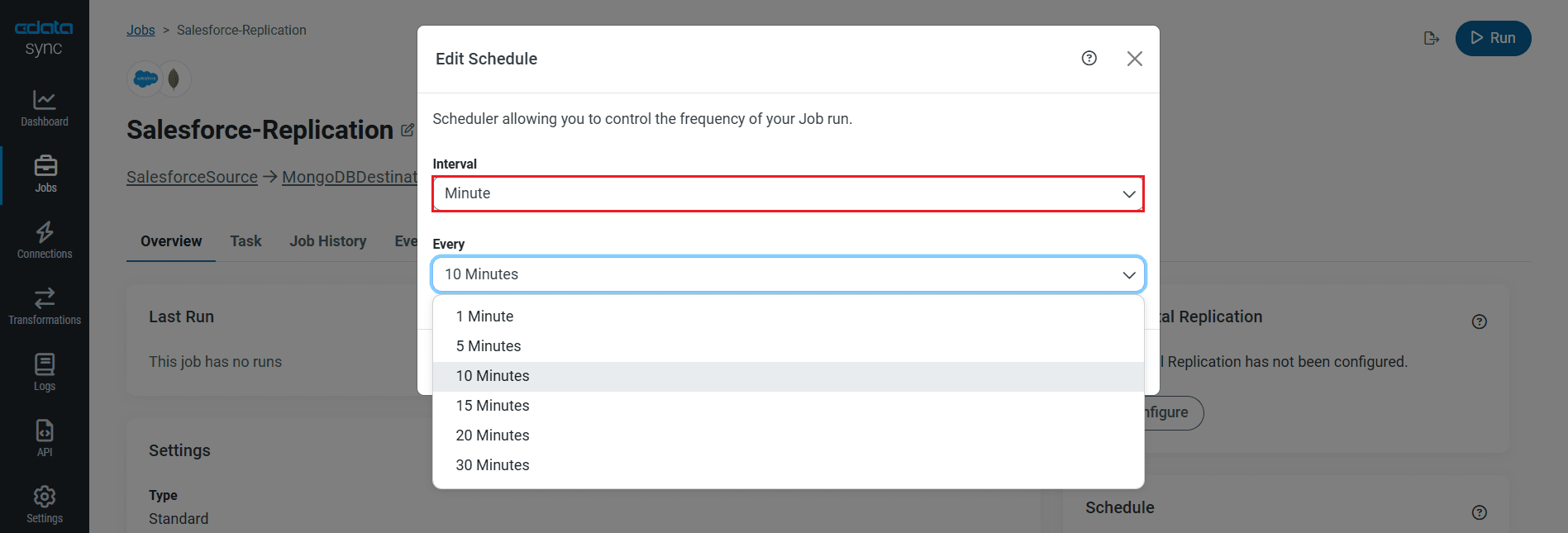 Select the Overview tab in the Job, and click Configure under Schedule. You can schedule a job to run automatically by configuring it to run at specified intervals, ranging from once every 10 minutes to once every month.