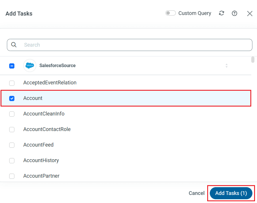 To replicate an entire table, navigate to the Task tab in the Job, click Add Tasks, choose the table(s) from the list of SQL Server tables you wish to replicate into Teradata, and click Add Tasks again.