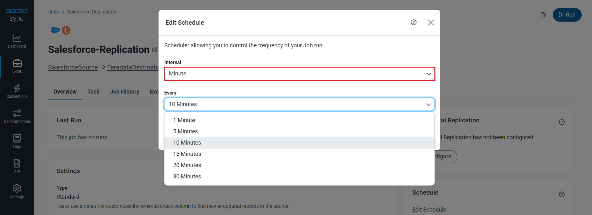 Select the Overview tab in the Job, and click Configure under Schedule. You can schedule a job to run automatically by configuring it to run at specified intervals, ranging from once every 10 minutes to once every month.