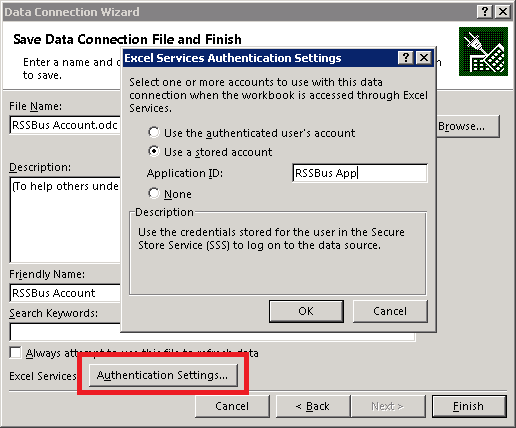 - On the last step of the wizard, click the 'Authentication Settings' button. Select the 'Use a stored account' and enter the name of the secure store target application you created earlier. Or, if you want to use the Unattended Service Account, select None.