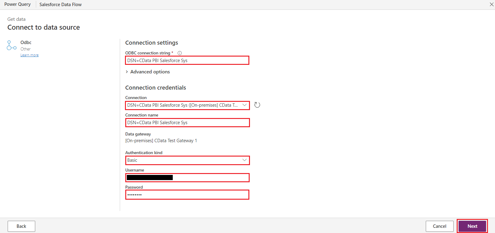 - On the ODBC Connection settings screen, use the connection details you set up earlier by entering DSN=Connection name (in this case, DSN=CData PBI TigerGraph Sys) in the connection string. The on-premise data gateway will display available gateways for connection - select the one you created. Due to the current specifications of Power Apps dataflows, authentication is required for ODBC connections. Choose Basic as the authentication type and enter the TigerGraph Username and Password. Click Next.