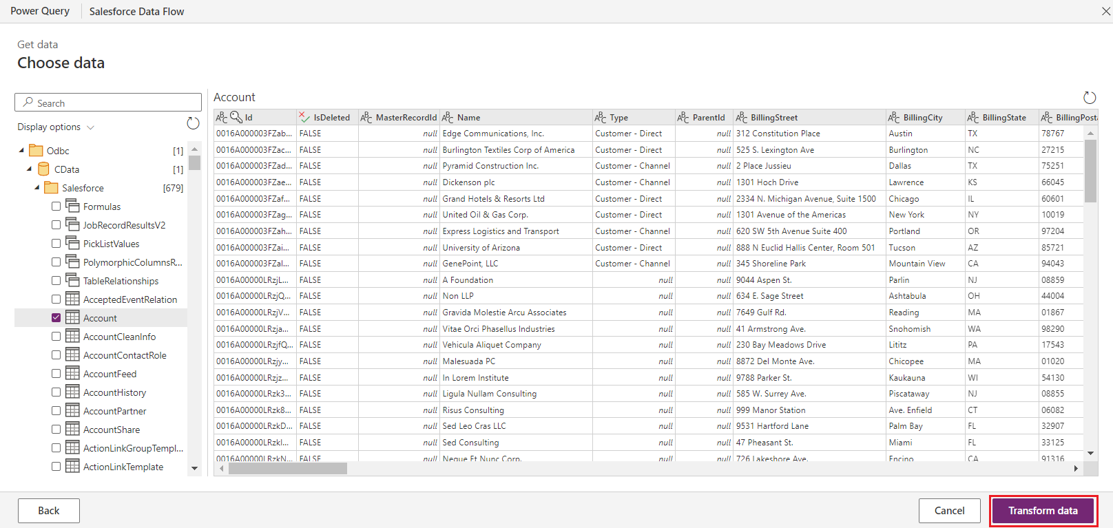 - TigerGraph is now connected to Power Apps. Under Display options, expand CData under ODBC and TigerGraph under CData, and a list of all the TigerGraph tables will appear in the panel. When you select any one of these tables, a preview will appear, showing that the TigerGraph data is correctly referenced through the Power BI connector and on-premise data gateway. Next, click on Transform Data.