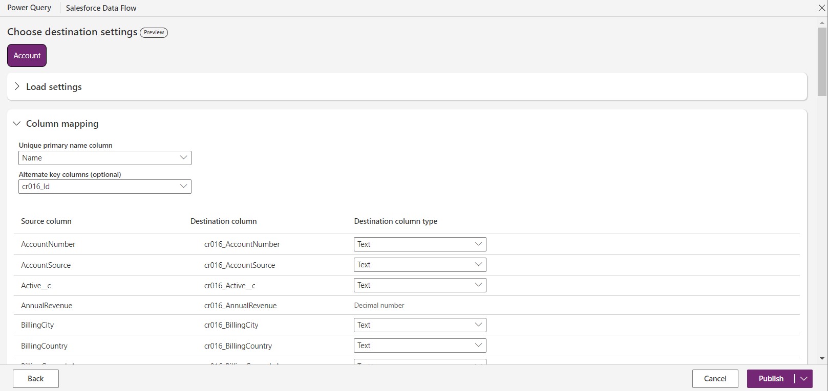 - In the Choose destination settings screen, you can select how the selected table needs to be loaded by choosing options like Load to new table, Load to existing table, and Do not load. You can also change the Table display name and description as required.