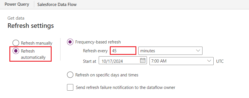 - Finally, choose how you'd like to update your data: Refresh manually or Refresh automatically. In this case, we have set it to Refresh automatically. By scheduling it to update every 45 minutes, as shown below, data will be collected and registered every 45 minutes timeframe, ensuring the most up-to-date information is always available. (You can select any timeframe based on your convenience)