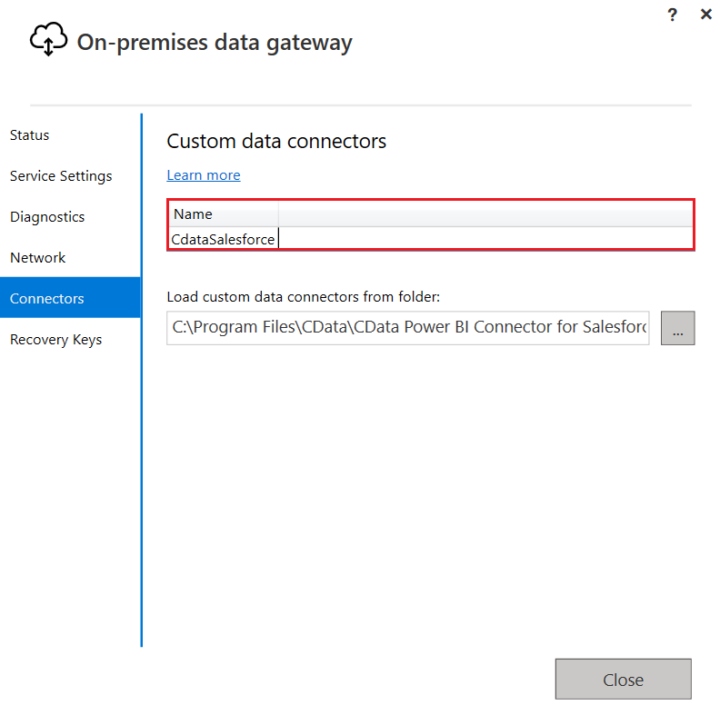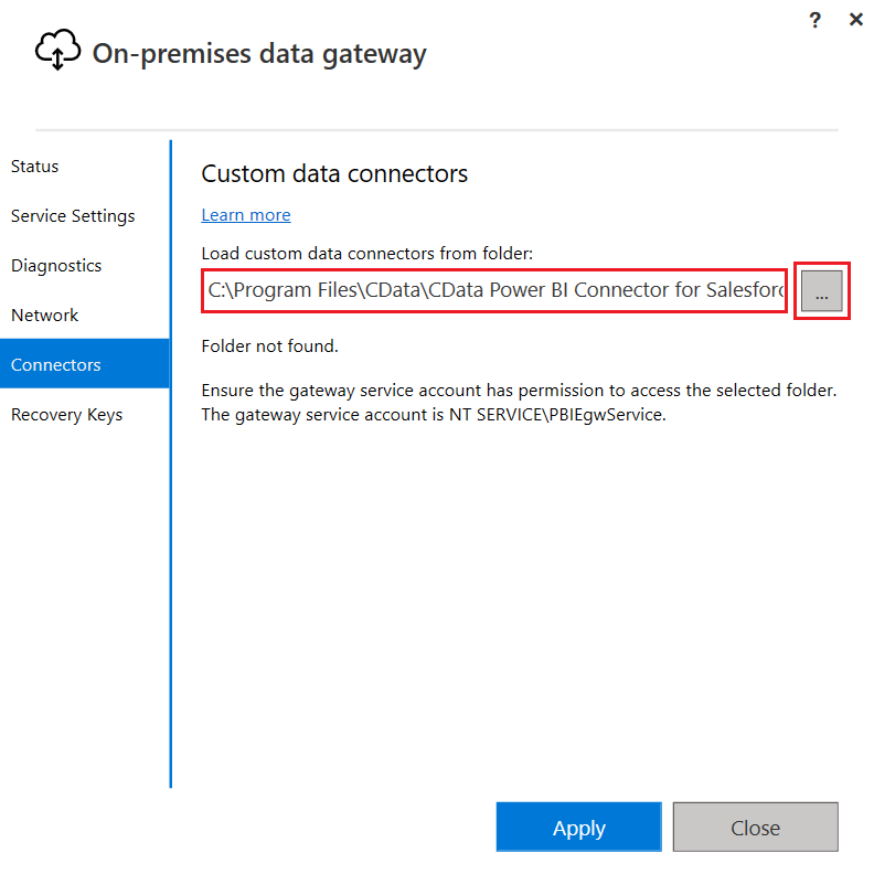 NOTE: Select the folder where the gateway will search for the CData Power BI Connector.