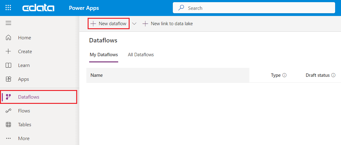 - Select Dataflows from the left panel on the Power Apps screen and click + New Dataflow.