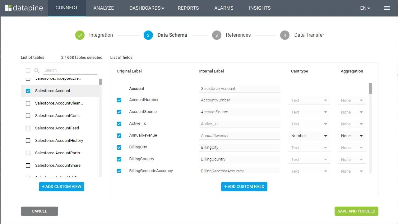 - In the Data Schema step, select the tables and fields to visualize and click "Save and Proceed"