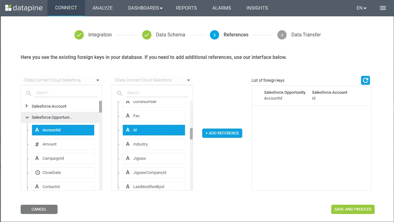 - In the References step, define any relationships between your selected tables and click "Save and Proceed"