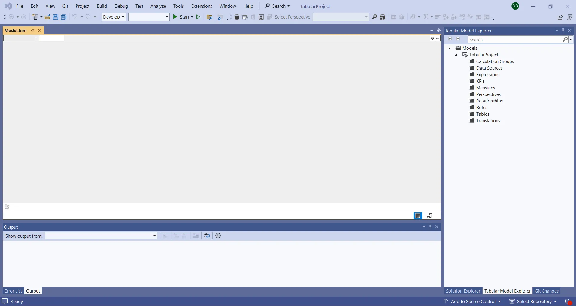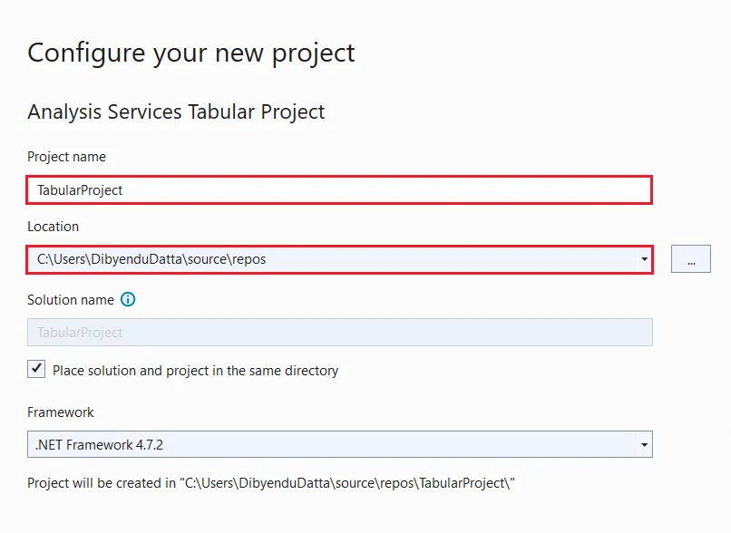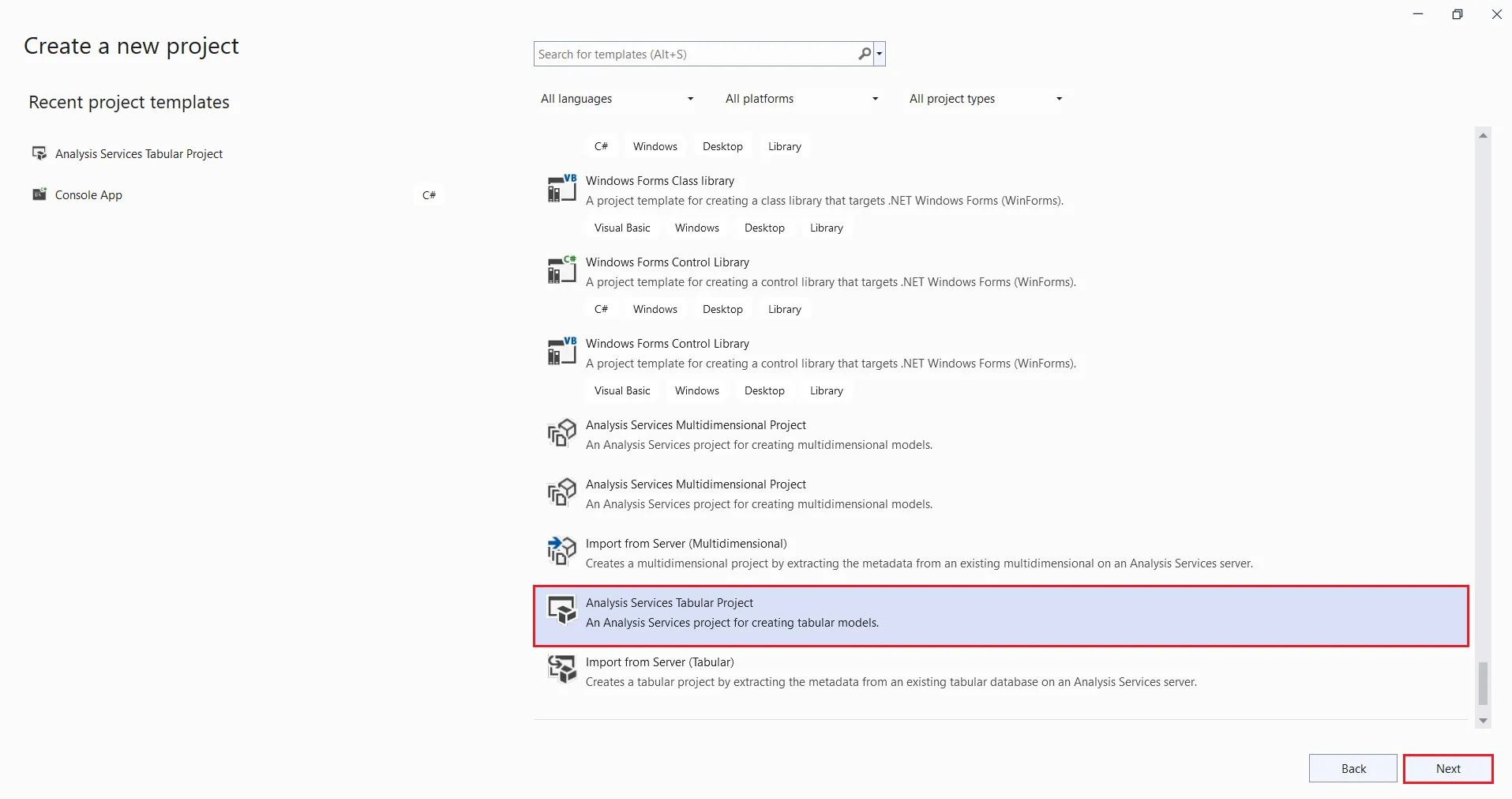 - In Visual Studio, create a new project. Select Analysis Services Tabular Project. Click on Next.