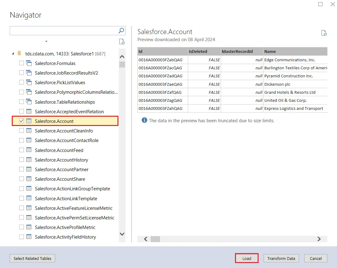 - You should now see the Salesforce table populated with data in the preview section on the right panel.
