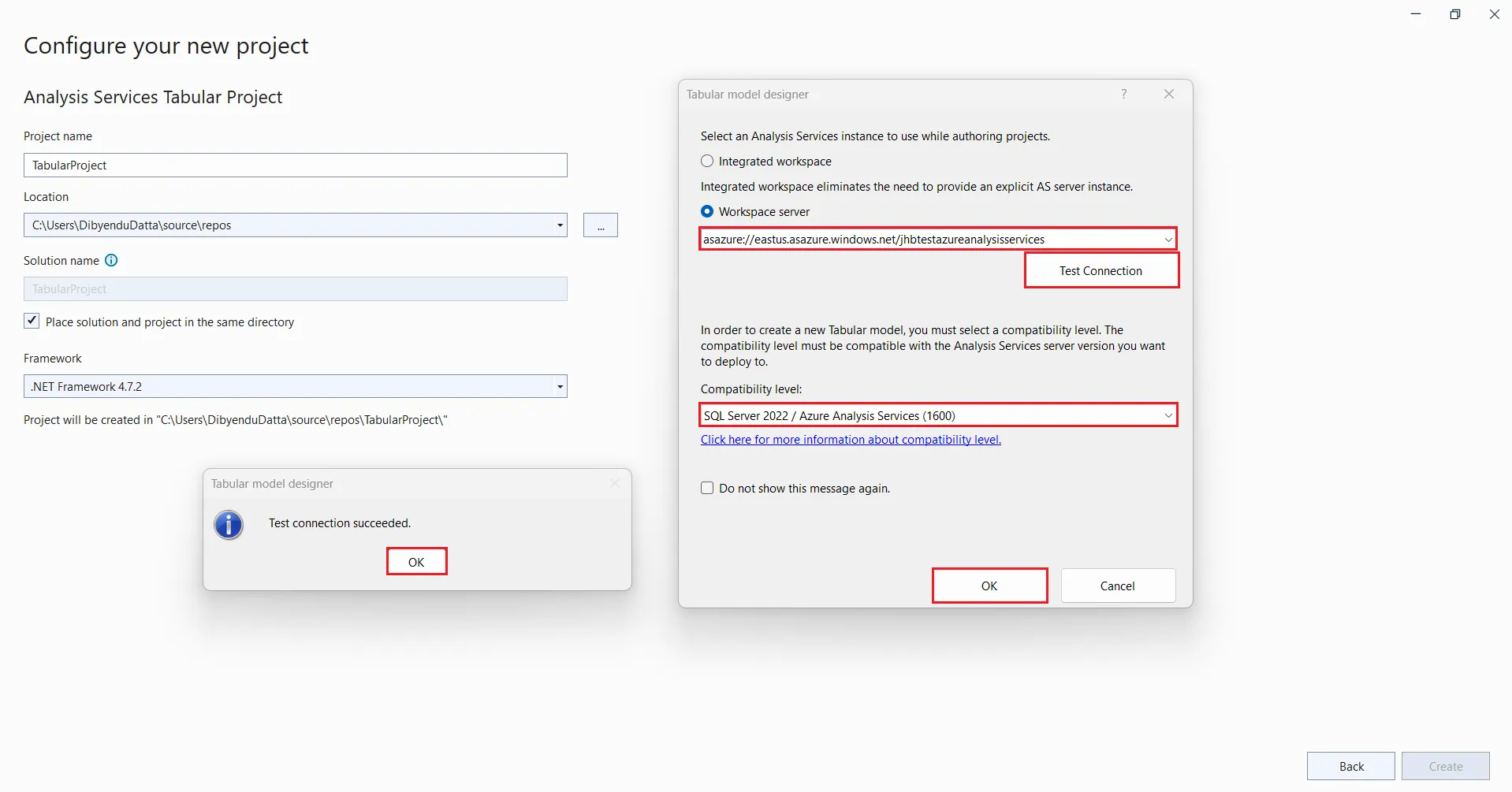- Click on Create. The Tabular model designer dialog box opens. Select Workspace server and enter the address of your Azure Analysis Services server (for example, asazure://eastus.azure.windows.net/myAzureServer). Also, make sure to select the option SQL Server 2022 / Azure Analysis Services (1600) from the Compatibility level dropdown. Click on Test Connection to check if the connection details are correct. Click OK and sign in to your server.