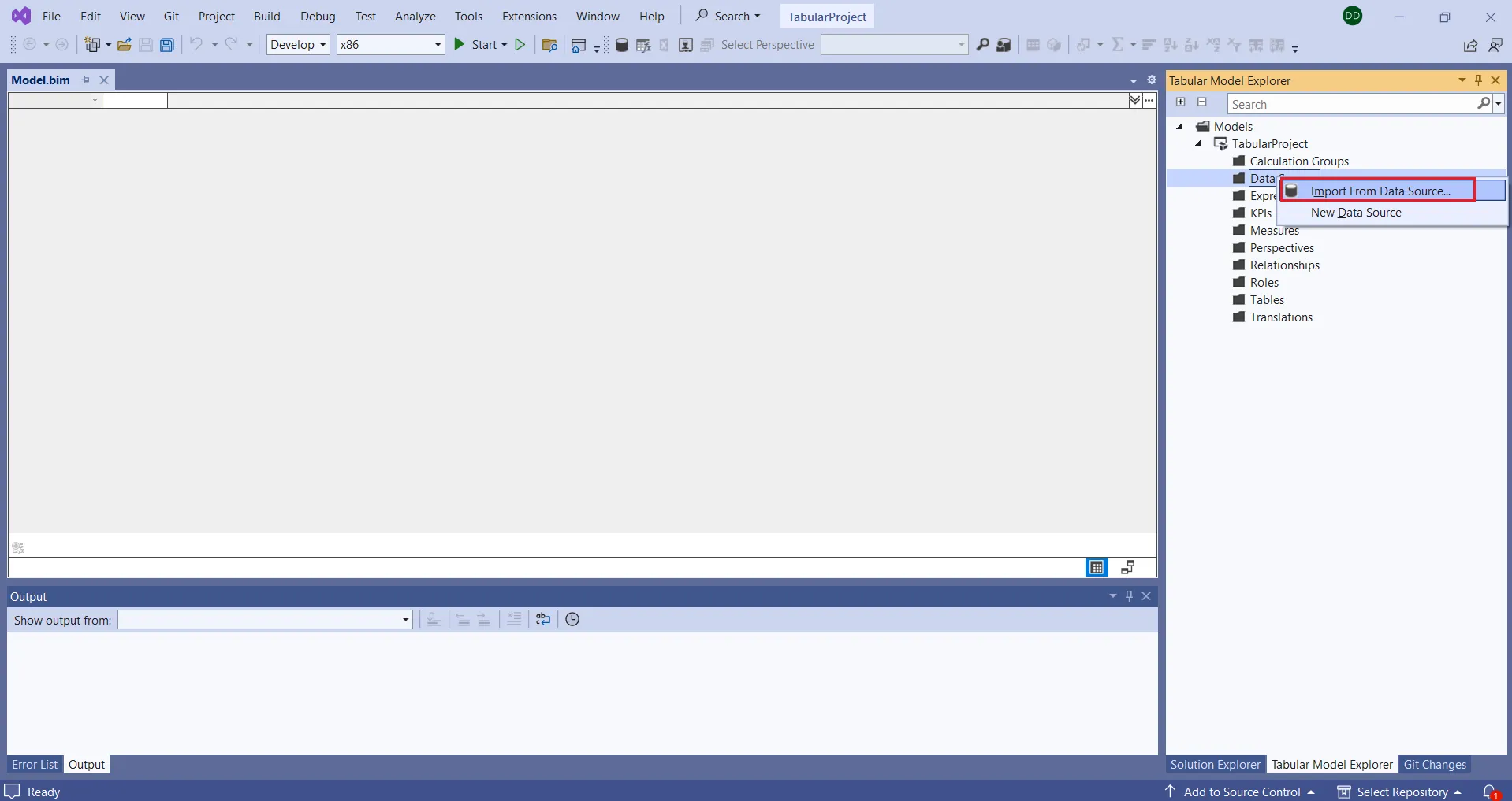 - In the Tabular Model Explorer window of Visual Studio, right-click Data Sources and select Import From Data Source.