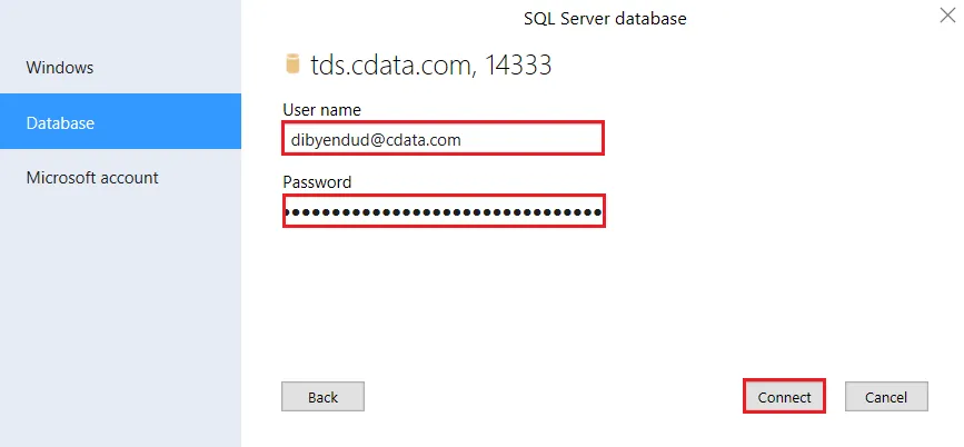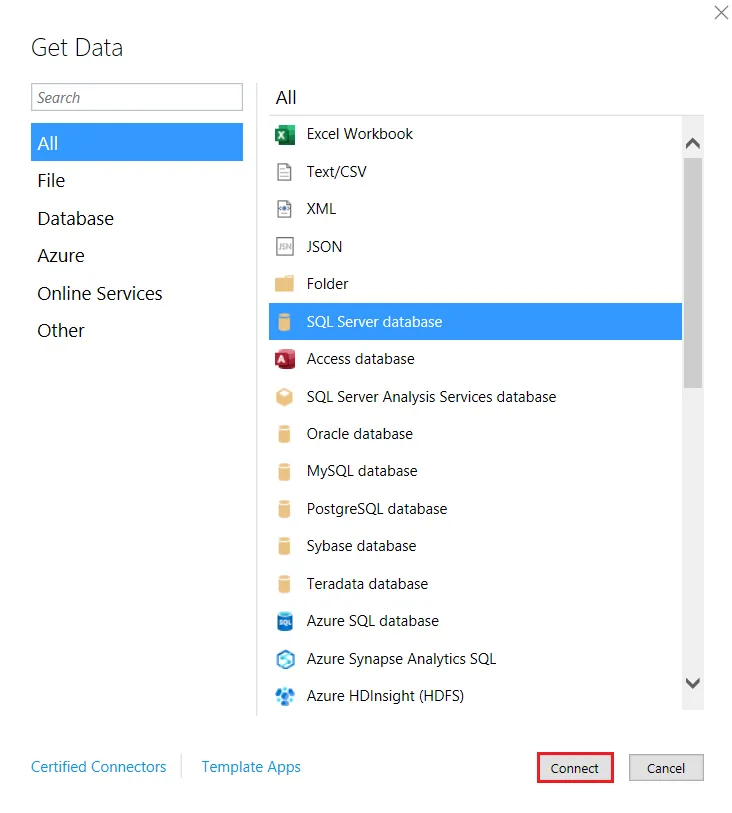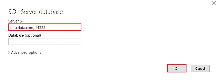 - In the Get Data window, select SQL Server database and click Connect. In the Server field, enter the Virtual SQL Server endpoint and the port separated by a comma: e.g., “tds.cdata.com, 14333”, and click on OK.