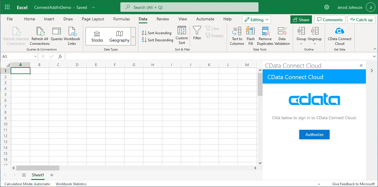 - In the Add-In panel, click Authorize to authenticate with your CData Connect Cloud instance