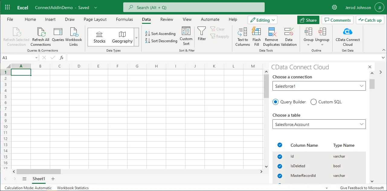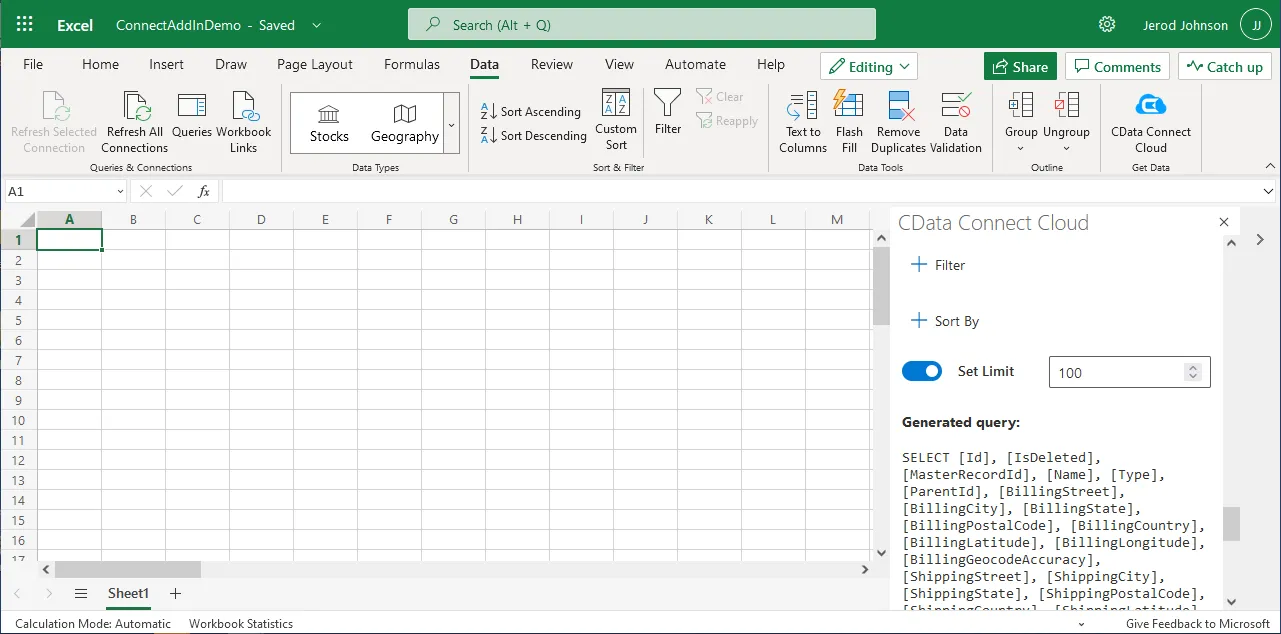 - Click Data and open the CData Connect Cloud Add-In.