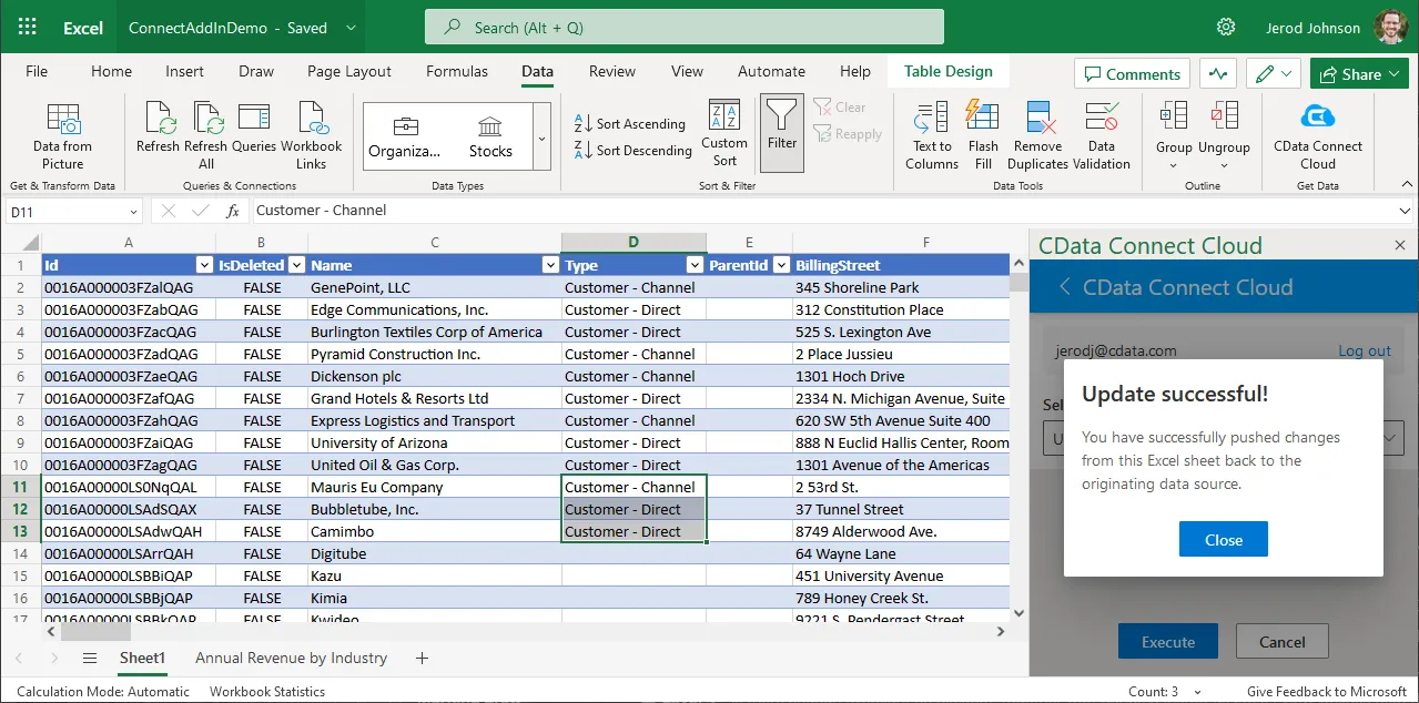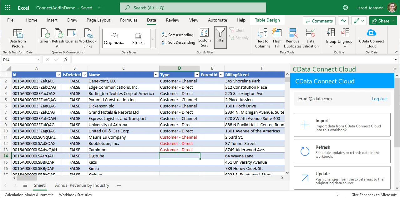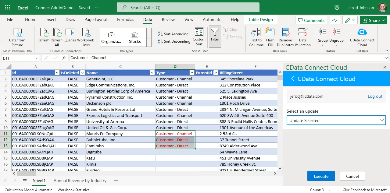 - In the CData Connect Cloud Add-In panel, select Update