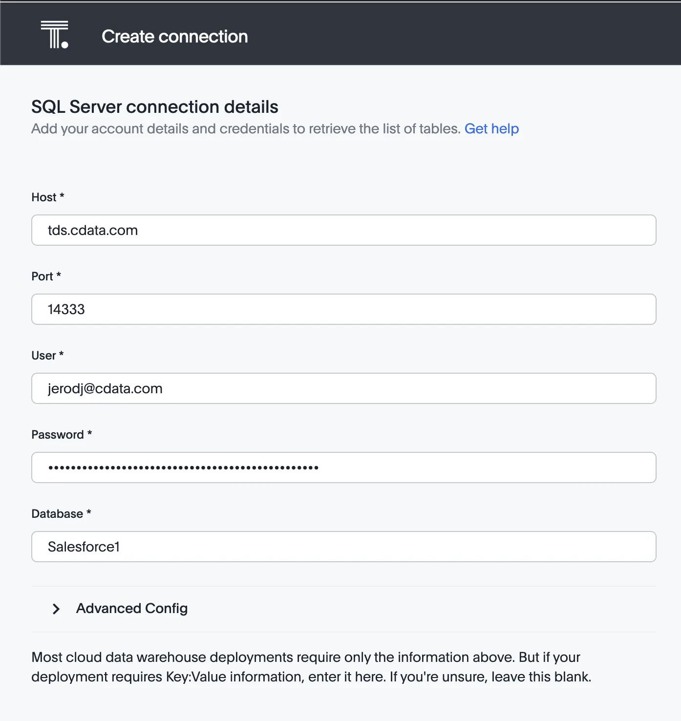 - Host: enter the Virtual SQL Server endpoint: tds.cdata.com