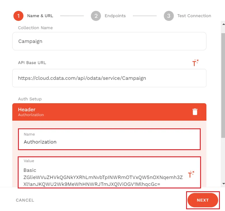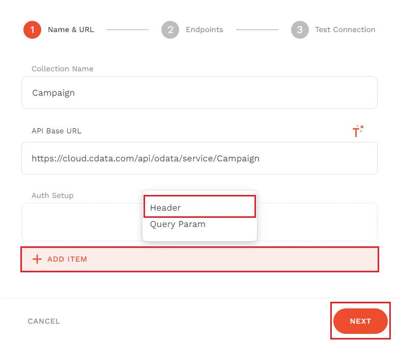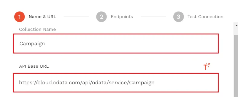 - On the External Collections registration screen, click on ADD COLLECTION to enter the collection name (any name of your choice), and provide the API base URL endpoint (OData endpoint registered on Connect Cloud). Make sure to add "/(table)" to the OData URL to access the specific endpoint. (Refer to the image given for reference)