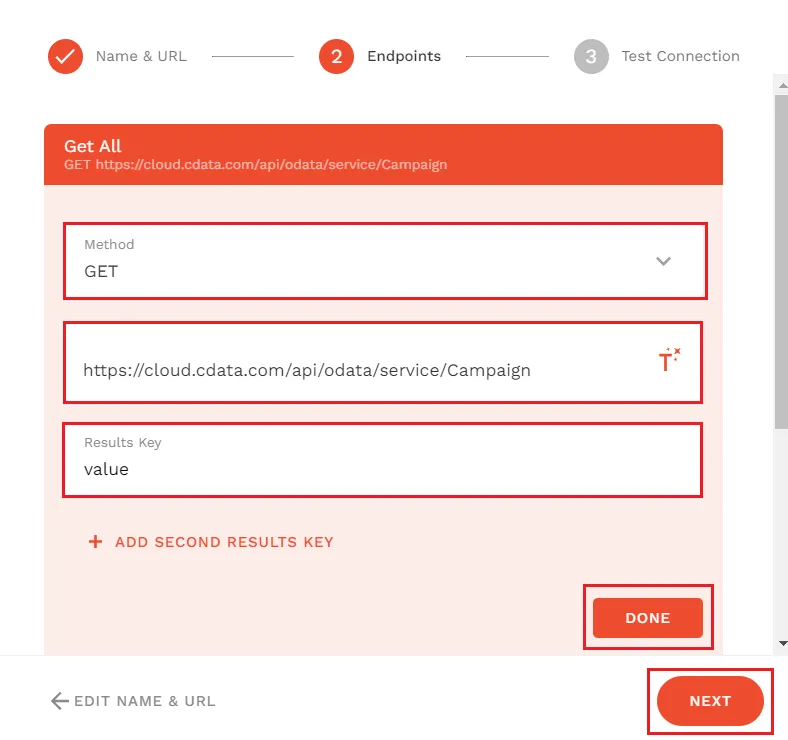 - Select Get All and enter "value" in the Results Key section. Click on Done and Next.