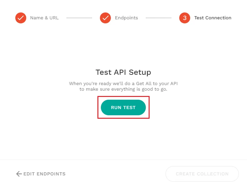 - Now, to test the API setup, click on RUN TEST. If you finally see the message and response shown below, the creation of External Collections is complete.