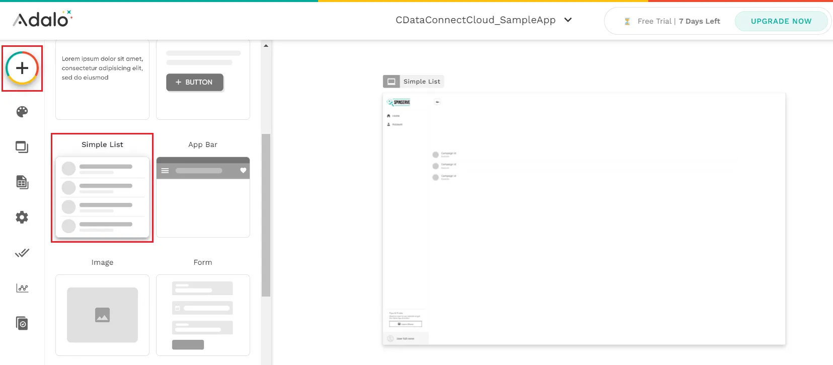 - First, click the + button in the upper right corner of the Adalo screen to display the list screen, then drag and drop "Simple List" onto the screen.