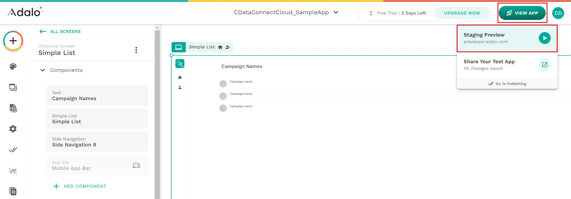 - Now, click on View App in the top right corner of the screen and select Staging Preview.