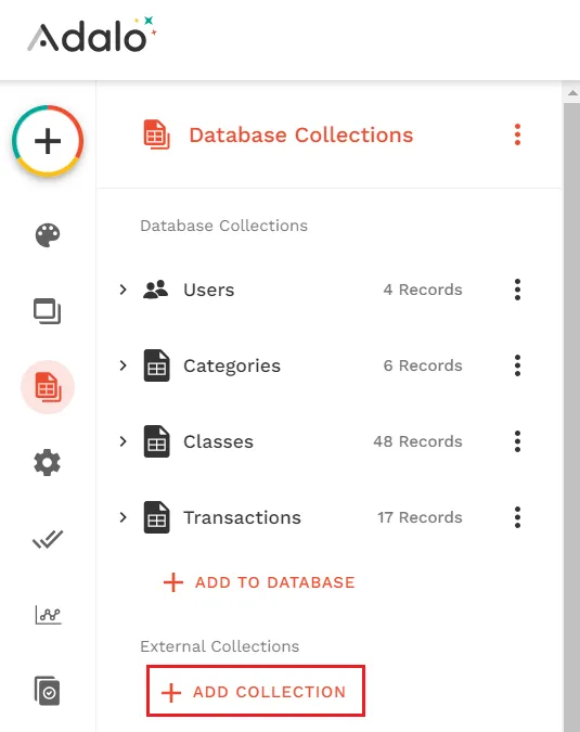 - After creating an app, you first need to register a Collection, which is a definition for handling data within the Adalo app. There are two types of Collections: Database Collections, which are like Adalo's own internal database, and External Collections, which allow access to external APIs. In this case, we will access an external API, registering it as an External Collection.