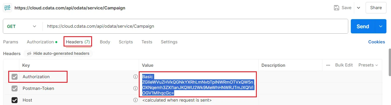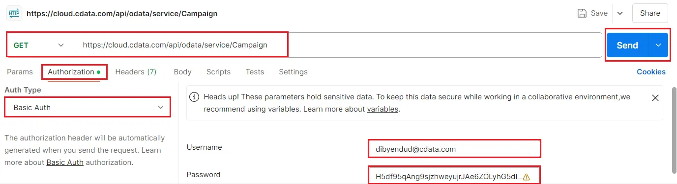 - Open the Postman application. Enter the OData URL mentioned in the previous step for a GET request on Postman. Click on the Authorization tab and select Auth Type as "Basic Auth". Enter the Username and Password as follows and click on Send:
