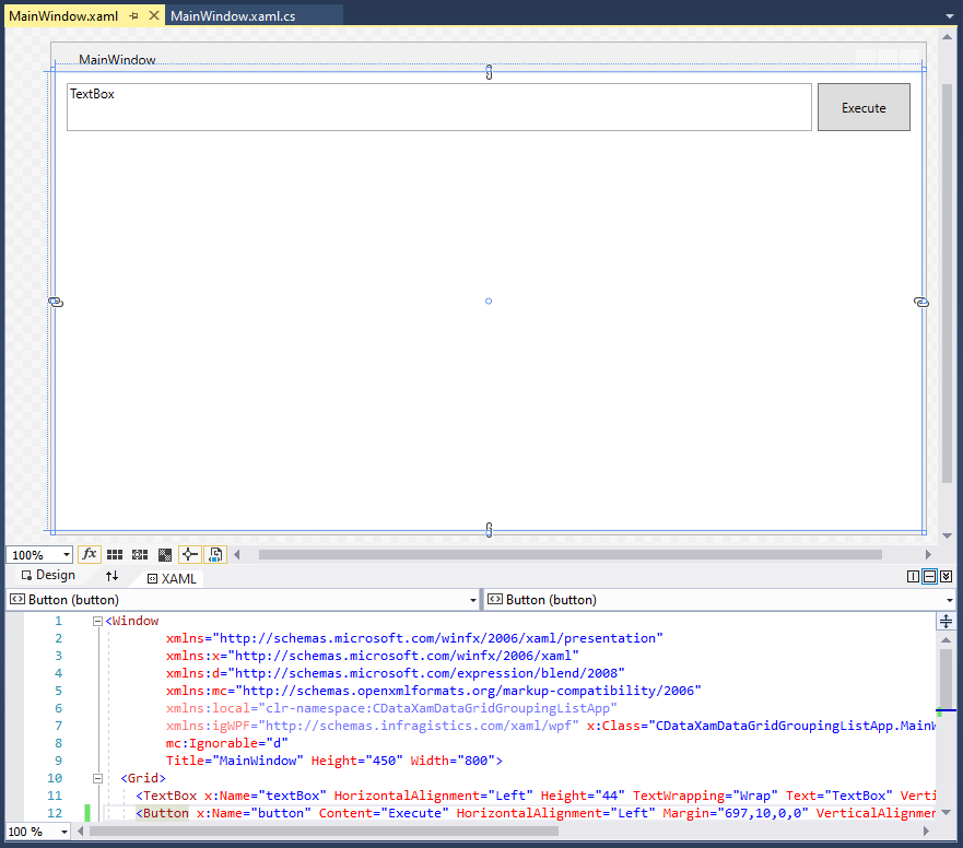 Once the XamDataGrid is placed, edit the XAML to set the XamDataGrid DataSource attribute to "{Binding}" and set the FieldSettings AllowRecordFiltering and AllowSummaries attributes to "true." Next, add an empty method as the Click event handler for the Button component. The XAML at this stage is as follows: